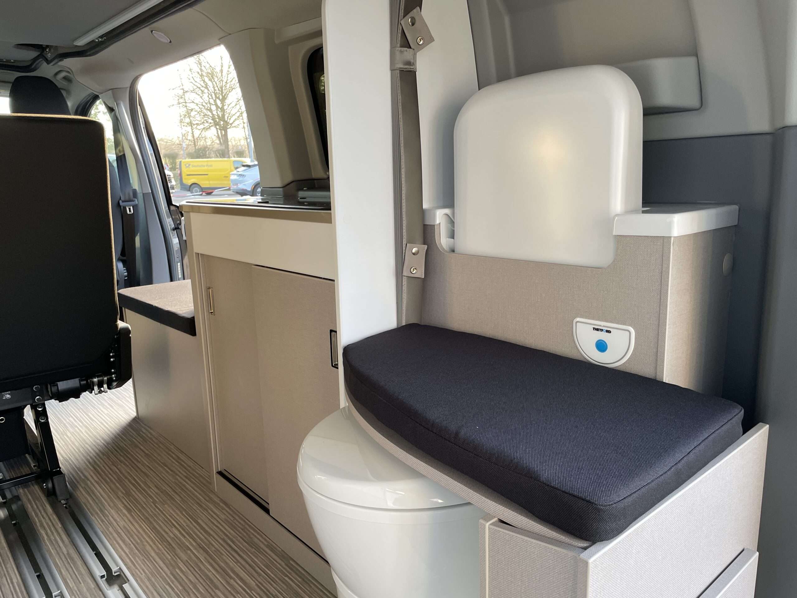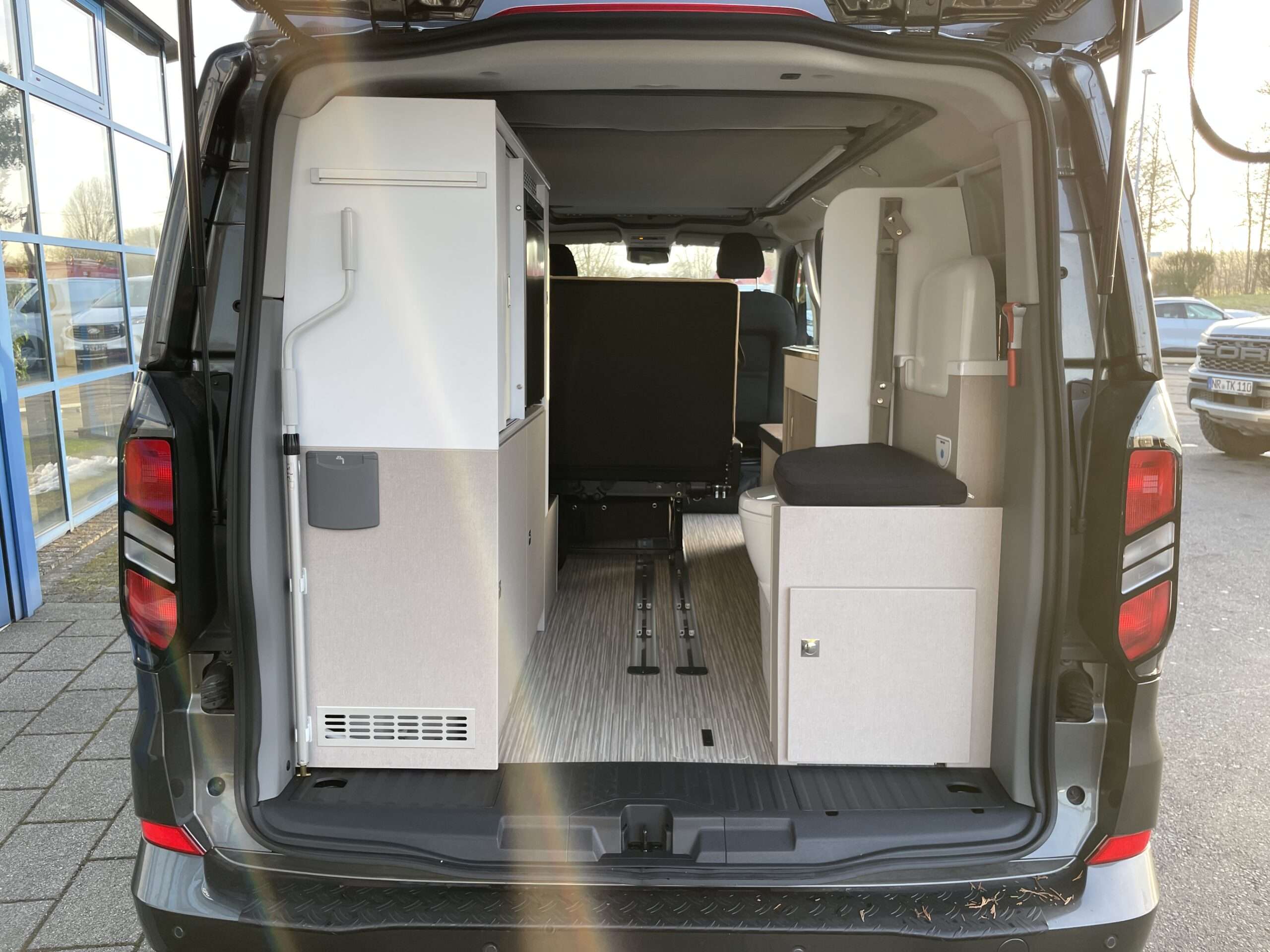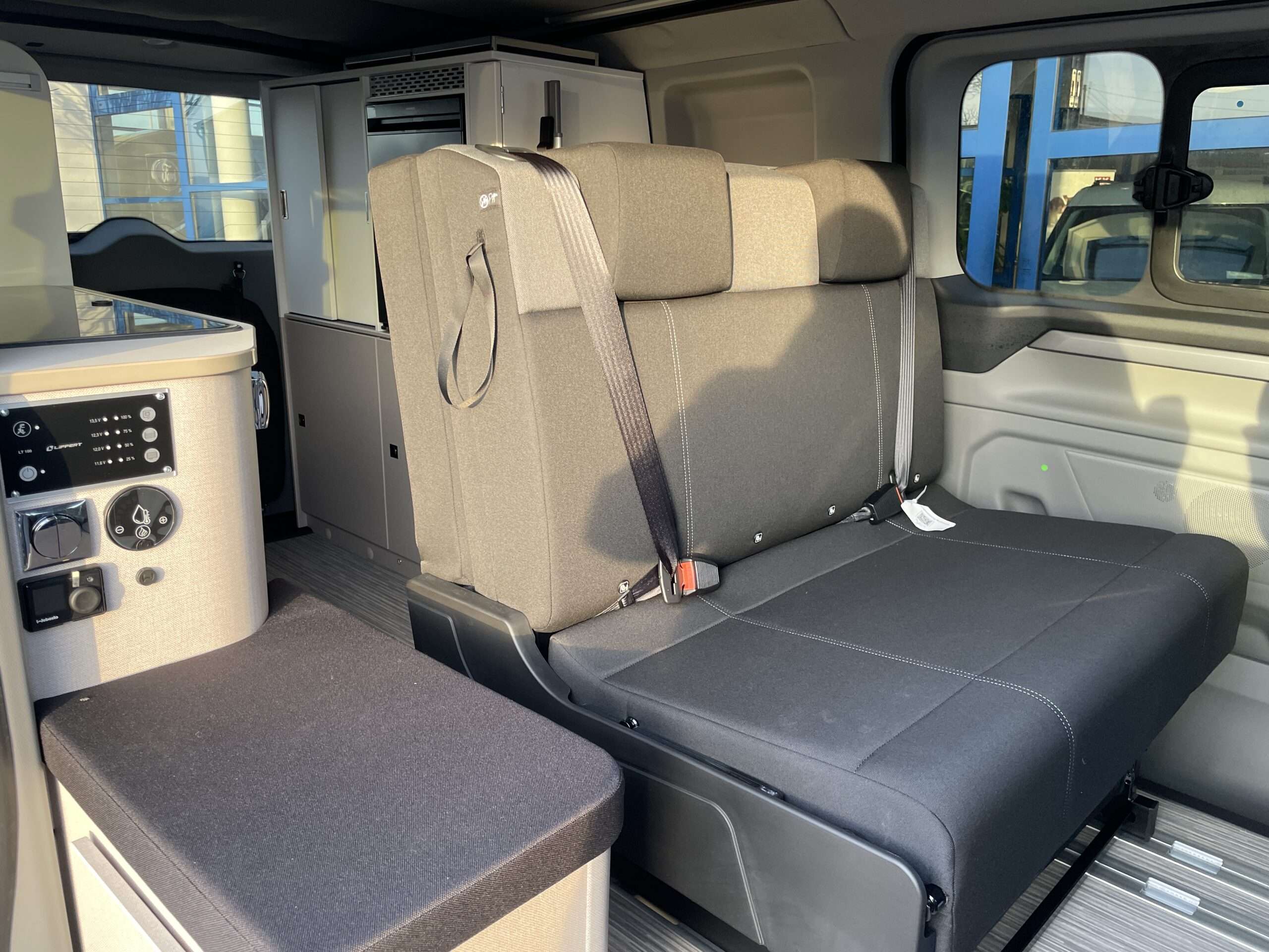 Die Sitzbank im Fahrgastraum, lässt sich im Handumdrehen in eine Schlafcouch verwandeln. Mit unserem Matratzentopper lassen sich auch hier bequeme und angenehme Nächste verbringen. Die Schlafcouch hat die Maße 1,90m x 1m (Länge x Breite) und bietet somit zwei weiteren Personen somit eine ideale Schlafgelegenheit.