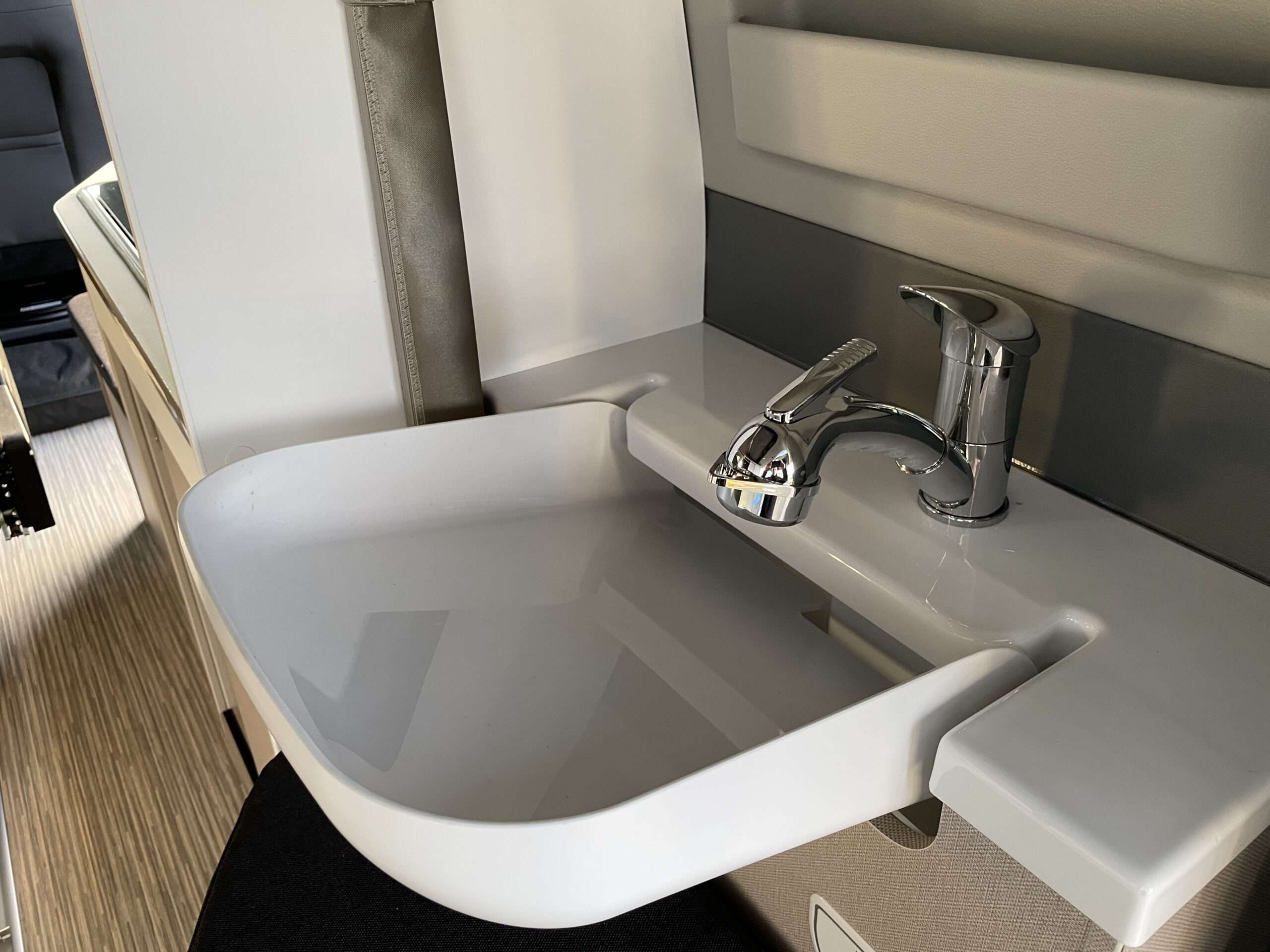 Im Heckbereich des Copa C530 befindet sich die Nasszelle. Darin zu finden sind ein Klappwaschbecken, eine eingebaute mobile Toilette sowie eine steckbare Duschwanne samt Duschvorhang inkl. eines herausziehbarem Wasserhahn als Duschkopf.