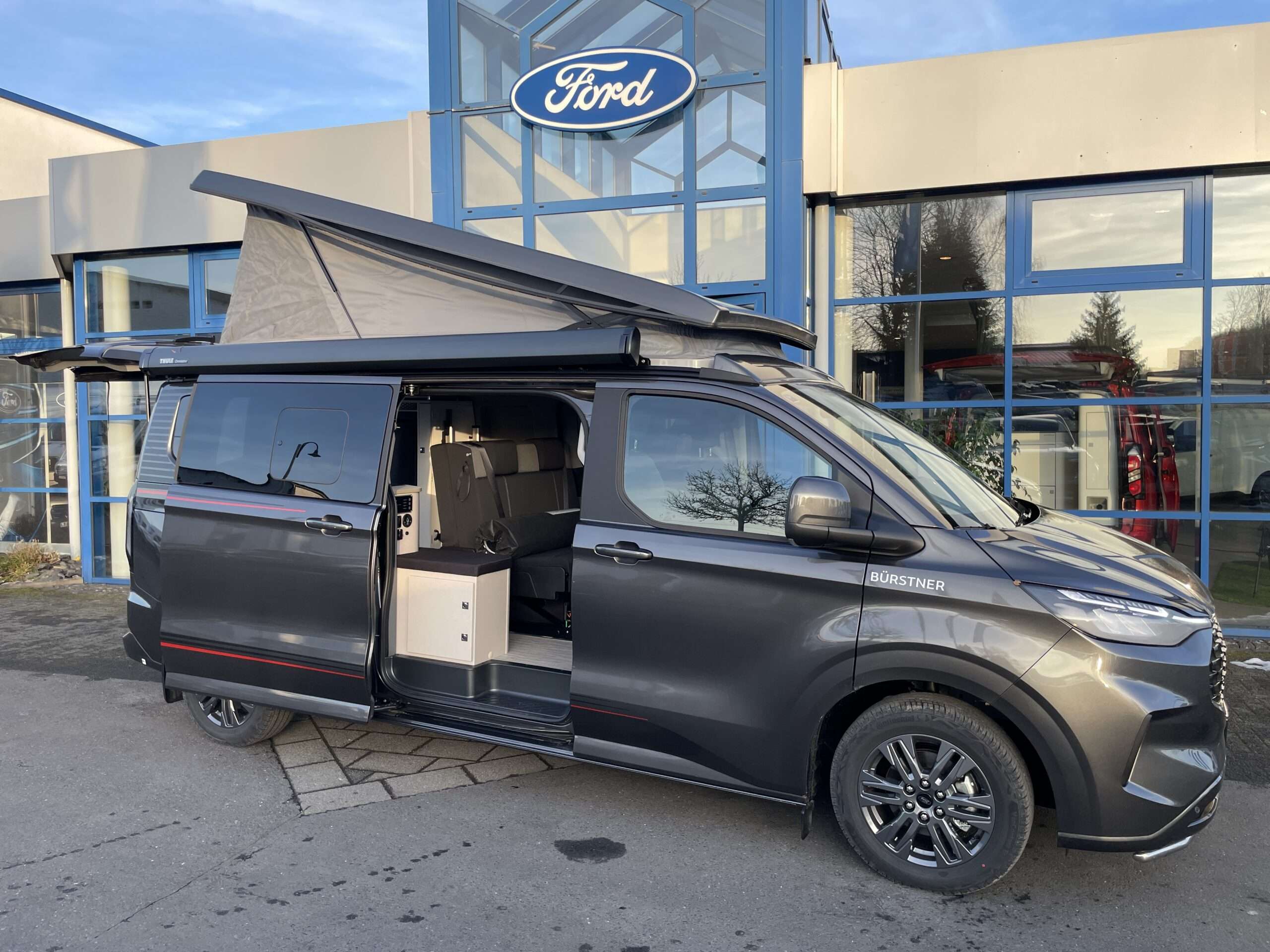 Innenraum-Küche seitlich im Fahrgastraum mit einer 47l Kühlschrank (davon 4,4l Gefrierfach), einem Zwei-Flamm-Gasherd samt Glasabdeckung, einer Arbeitsfläche, Edelstahlspülbecken, sowie Besteckschubladen und Staufächern.