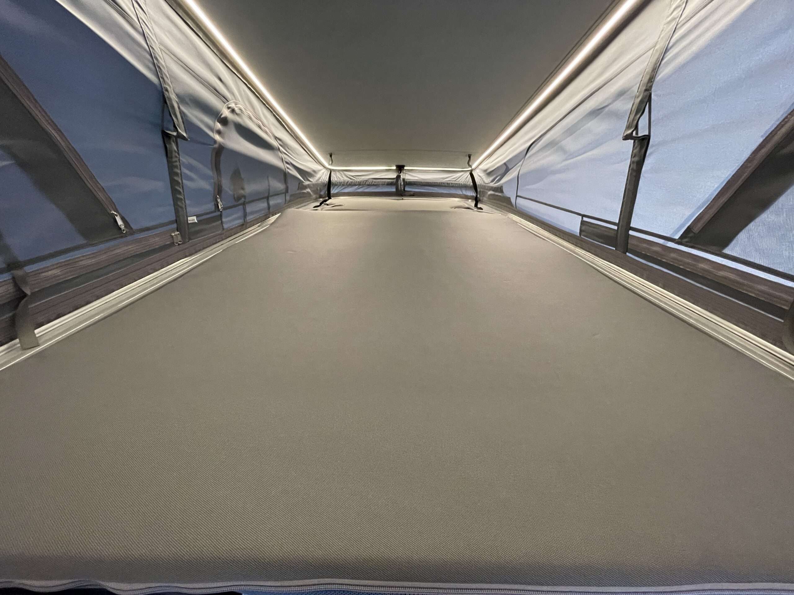 Das gemütliche neue Doppelbett im Aufstelldach besitzt hochwertige Tellerfedern für einen hohen Schlafkomfort. Das Bett hat die Maße 2,35m x 1,18m (Länge x Breite).