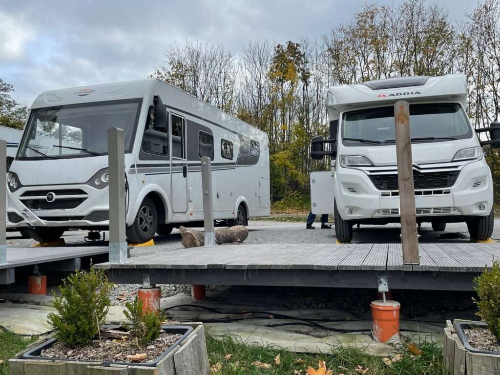 Die parzellierten Stellflächen sind weitgehend eben, mit grobem Kies/Sand.